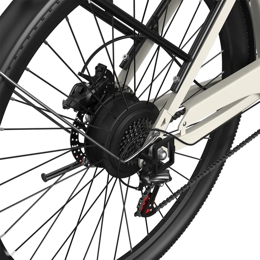 Qua techniek biedt dit model een combinatie van een 36V Samsung-accu, een 250W brushless achtermotor, Shimano 7-speed transmissie en mechanische schijfremmen. Het frame is van alloy en de voorvork gebruikt aluminium verstelbare schokdempers. Daarmee is de fiets duidelijk gericht op regulier dagelijks gebruik met gangbare, herkenbare onderdelen.